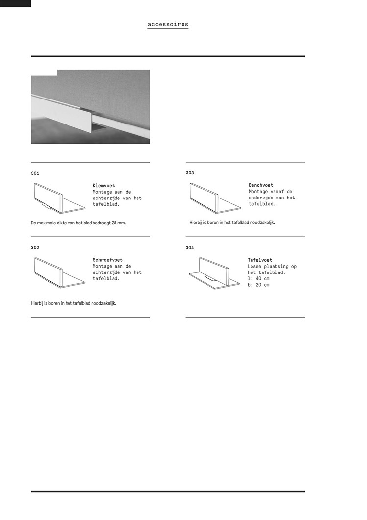 Montage aan de achterzijde van het tafelblad d.m.v. een klemsysteem. De klem past op een blad van max. 28mm dik.