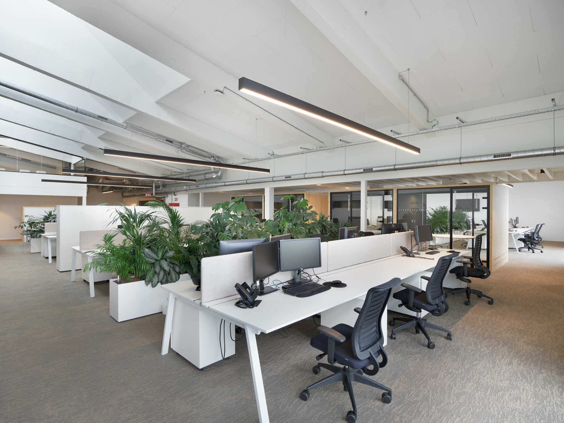 De werkposten werden corona-proof uitgetekend. Daarom viel de keuze op de ruime Stilo benchwerkplekken. Momenteel bieden deze plaats aan vier personen, maar zonder corona-maatregelen kunnen aan één Stilo bench ook zes werkplekken gevormd worden. Elke bench werd uitgevoerd met bijhorende opzetwanden en voldoende kabelvoorzieningen. Daarnaast is elke individuele werkplek voorzien van een ladeblok voor wat persoonlijke opbergruimte, en een comfortabele, ergonomische Reflex bureaustoel.
