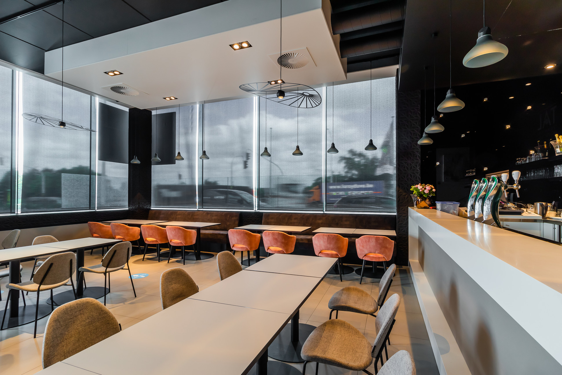 In het nieuwe interieur vallen vooral de poederroze Milo stoelen op. Deze uiterst comfortabele stoelen vormen een prachtige combinatie met de grijze Nola stoelen. Ook de tafels kregen een facelift. De onderstellen kregen een nieuwe zwarte kleur en de zijkant van elk tafelblad werd voorzien van een een zwarte rand.
