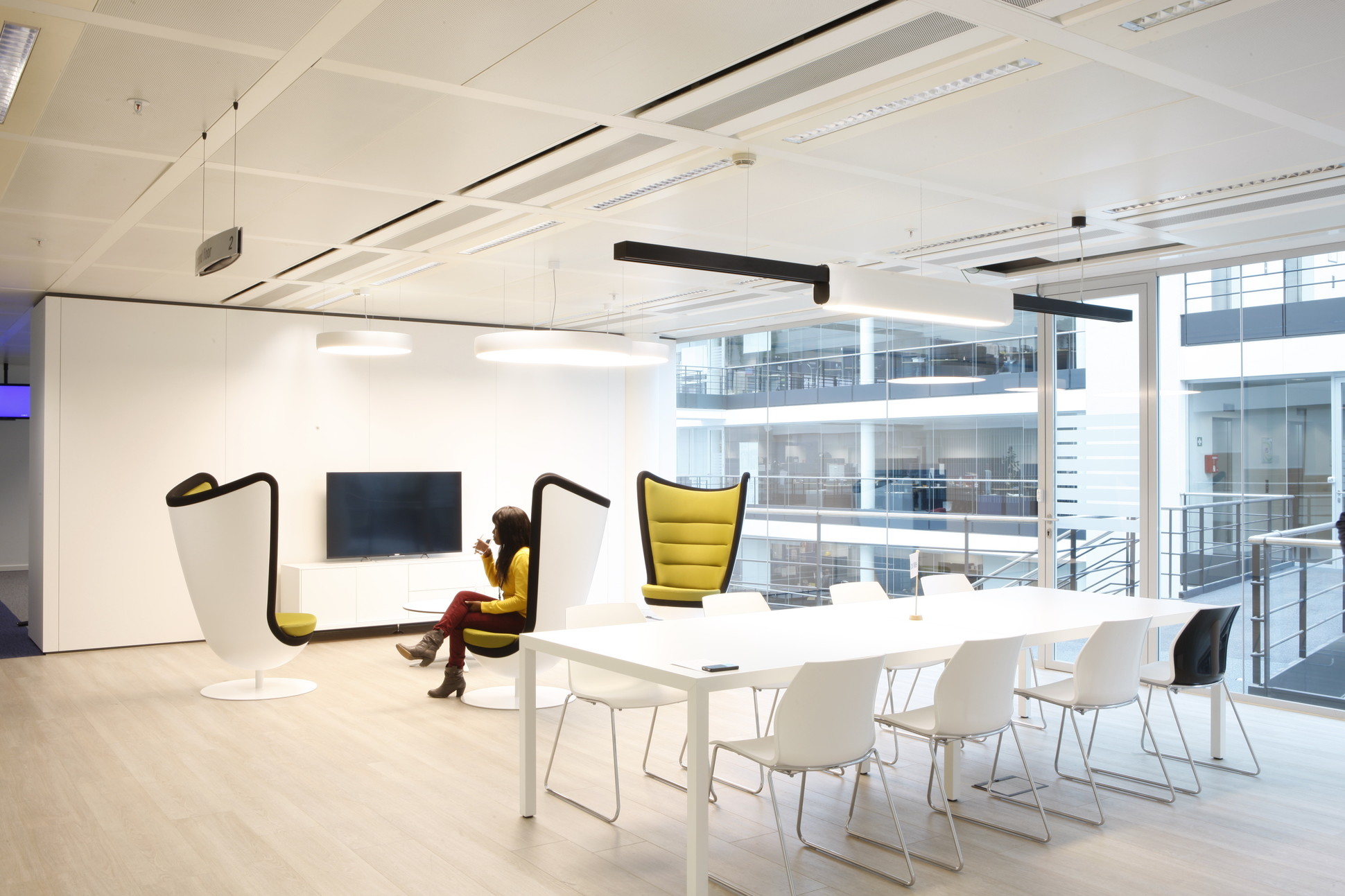 De ontvangstruimte van een bedrijf moet onmiddellijk een goede eerste indruk nalaten. Onze experts raadden Mitel meteen de design Badminton draaifauteuils aan, aangezien zij een echte blikvanger zijn en zeer comfortabel zitten. In de “welcome area” van Mitel plaatsten we in samenwerking met onze partners een stijlvolle kitchenette. Door de combinatie van Badminton fauteuils, een grote witte Prisma tafel en Kalea sledestoelen werd er een ruimte gecreëerd met veel uitstraling.