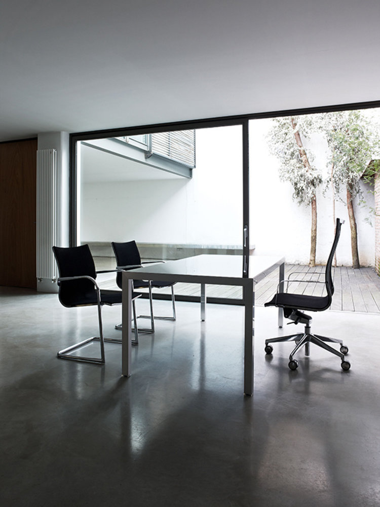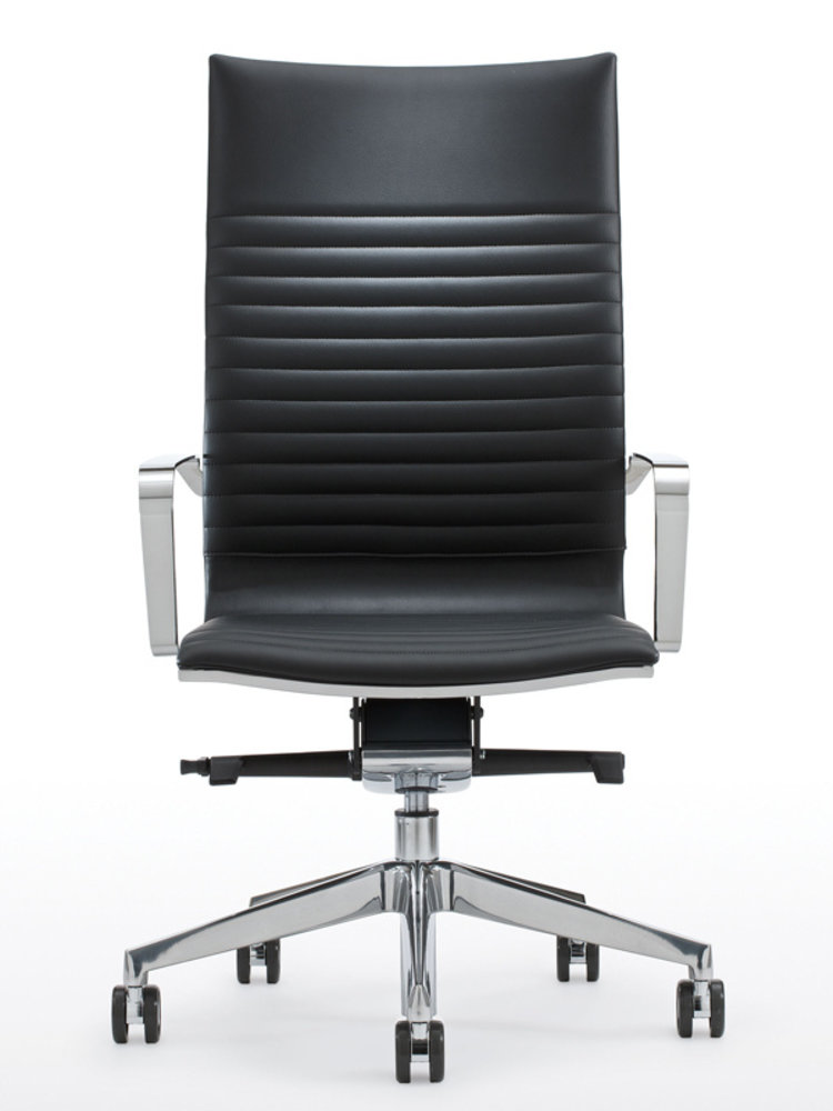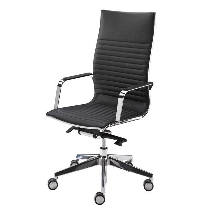 Deze directeurszetel heeft vaste verchroomde armleuningen, bovenaan afgewerkt in het zwart skai-leder. Het onderstel is een 5-spaaks gepolijst aluminium kruisvoet met verchroomde wielen en gasveer.
