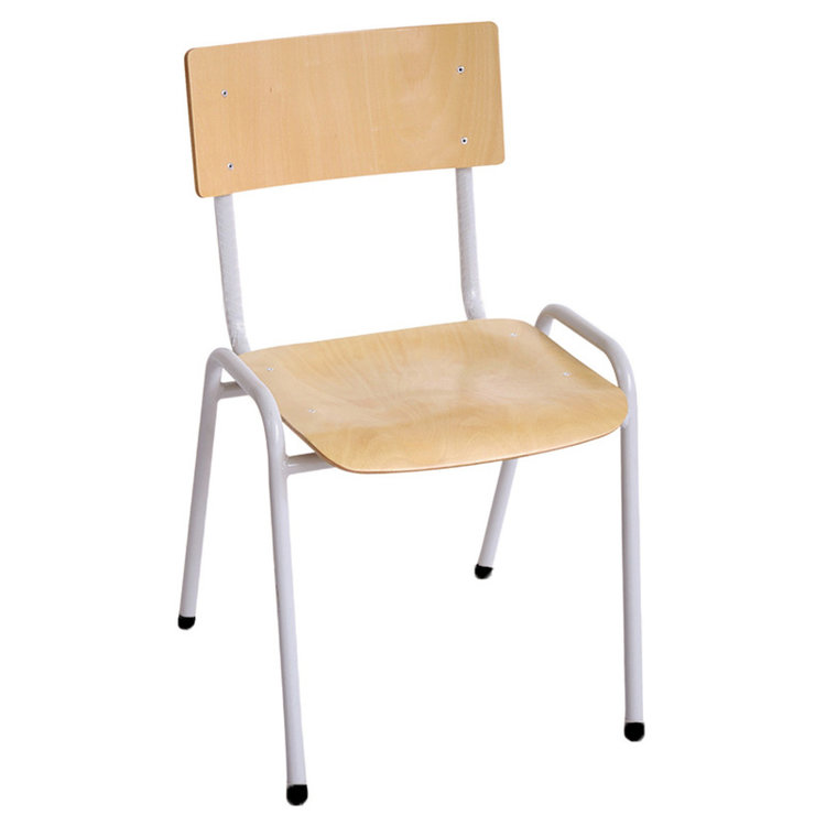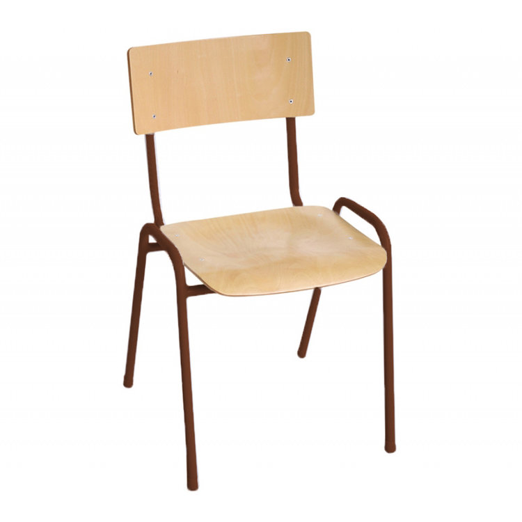 Stapelbare schoolstoel, geschikt voor gebruik aan een leerlingentafel of in de refter. Deze stapelbare kantinestoel heeft een stevige onderstel uit metaal en is voorzien van vloerdoppen. De rugleuning en zitting zijn uitgevoerd in multiplex beuk. Deze stoelen zijn geschikt voo kleuterscholen, basisscholen en middelbare scholen.