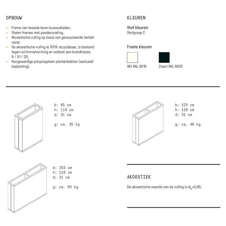 De Sena plantenbak absorbeert op een heel effectieve manier geluid, met name ook de moeilijk wegneembare lage frequenties. Planten zijn goed voor de luchtkwaliteit én verstrooien geluid, waarmee hinderlijke geluidsreflecties worden verminderd. Sena is voor meer dan 70% opgebouwd uit gerecycleerde materialen.