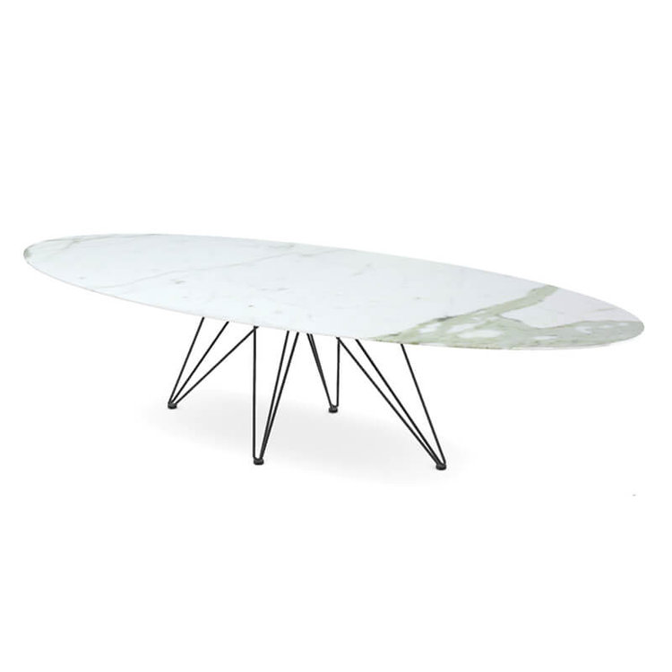De Wire-collectie van Joli straalt klasse en elegantie uit. Fijne zwarte inox-draden zorgen ervoor dat het onderstel zeer uniek is. De combinatie met het ovalen Calacatta topblad met normale afronding zorgt voor een heel luxueuze uitstraling.