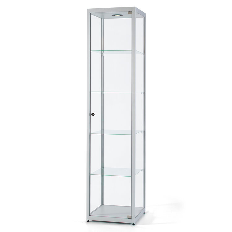 De vitrinekast van 40bx40dx200h is ideaal om uw producten te presenteren. De glazen legborden geven de vitrinekast een transparant karakter. Dit wordt nog eens verstrekt door de sfeervolle verlichting vanaf de bovenkant. Leverbaar in 2 kleuren.